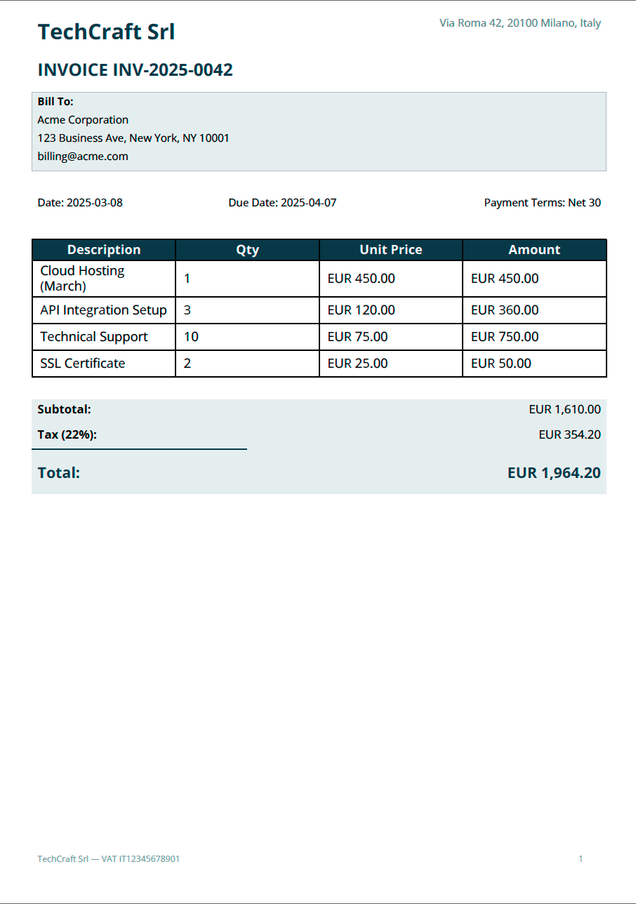 A professional invoice with company header, client details, itemized table, and totals — all driven by JSON data.